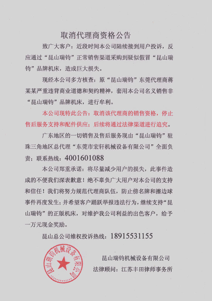昆山瑞鈞取消代理商資格公告